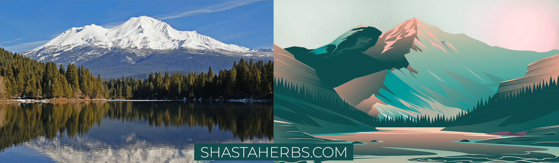Hình minh họa: Ngọn núi Shasta được vẽ lại để dùng làm hình ảnh thương hiệu của Shasta Herbs.